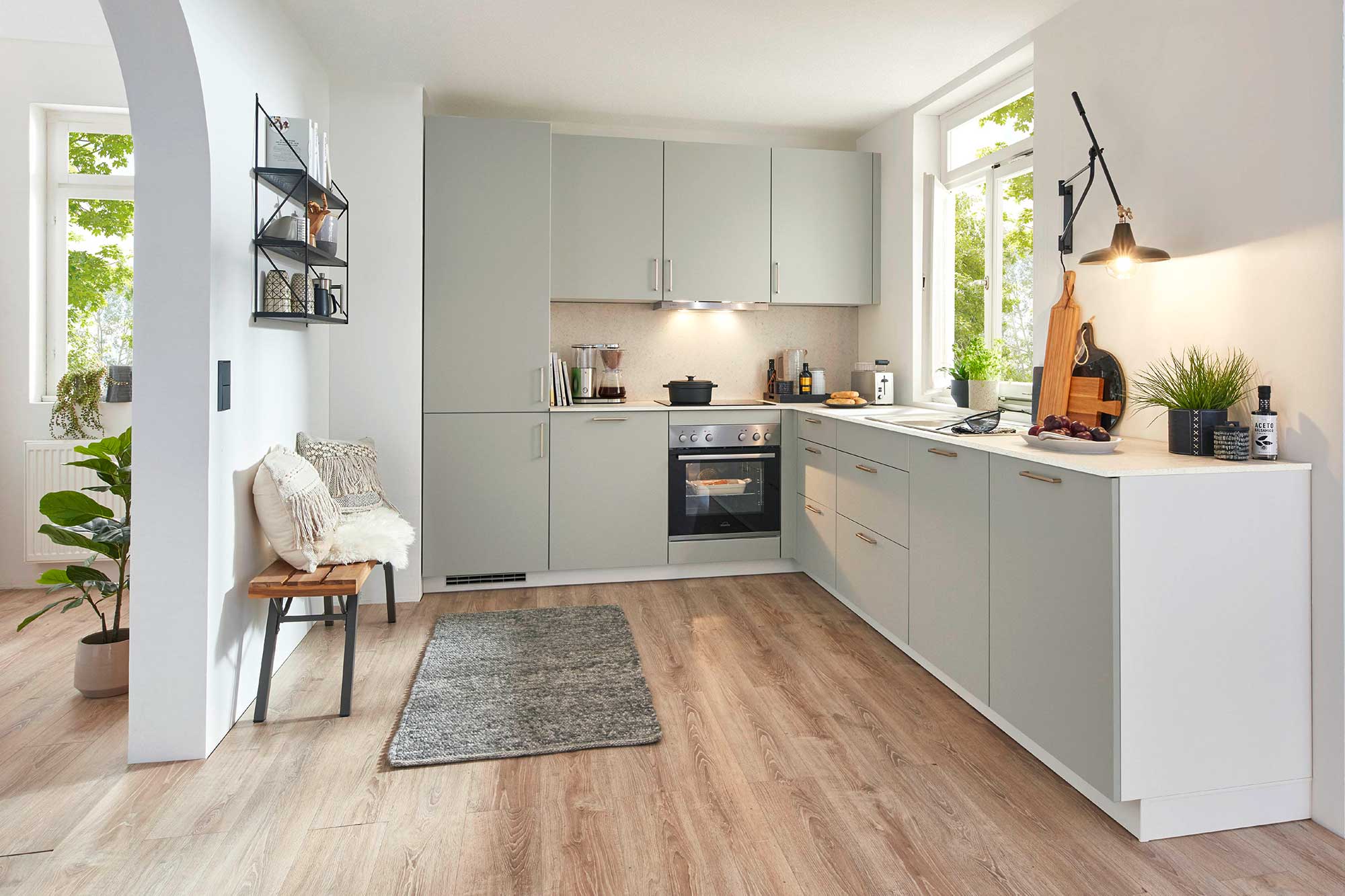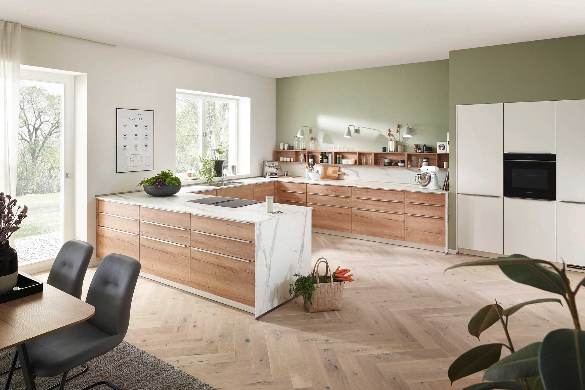 This soft green, matte slab kitchen adds a touch of colour for an inviting, uplifting feel. A crisp white quartz worktop and stone-effect splashback bring contrast and texture, creating a space that feels calm, contemporary, and beautifully connected to nature.